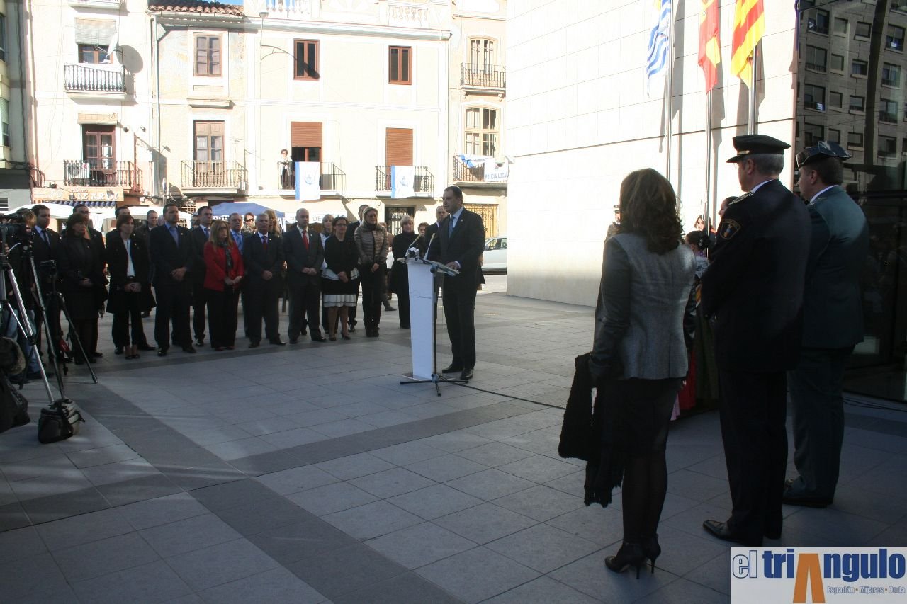 En el acto institucional, tras el izado de las cuatro banderas, ha pronunciado un discurso el alcalde, Salvador Aguilella, que ha hecho un llamamiento de unión a la sociedad en su conjunto: “Caminemos por la senda de la participación, la transparencia y el consenso. Debemos rectificar errores y mejorar nuestra organización como sociedad. Toda administración debería gastar con rigor y criterio, algo que en España no ha sucedido durante muchos años”, según transcribe una nota del Departamento de Comunicación del Ayuntamiento. Muchas de las más de 200 personas asistentes al acto, en su mayoría pertenecientes a asociaciones, han comentado en ese momento que quizás se refería a los gastos superfluos realizados por la Generalitat en el aeropuerto, la Ciudad de la Luz, la Ciudad de las Artes y las Ciencias, Terra Mítica, en la fórmula 1, la Copa América y otros eventos, en tiempos de Zaplana y Camps como presidentes, que han dejado altamente endedudada a la Comunitat Valenciana.